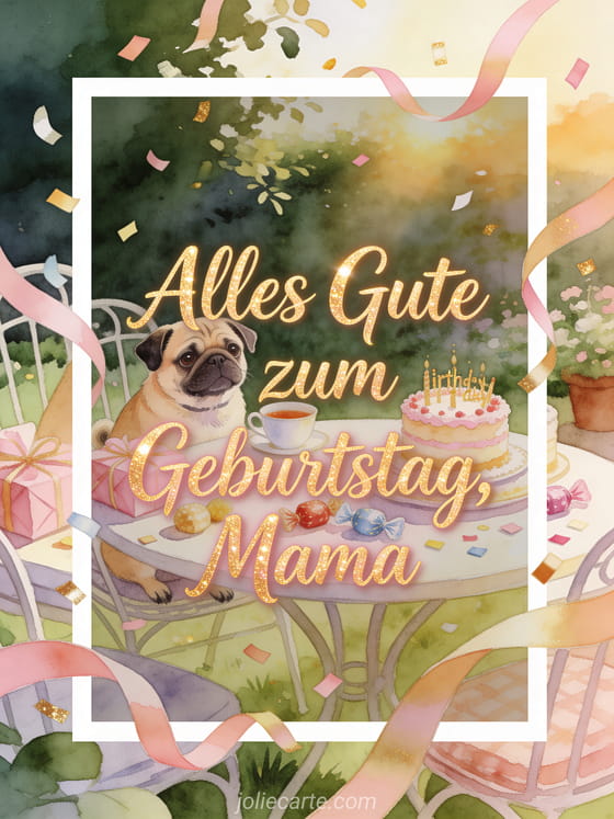 Teile ein Alles Gute zum Geburtstag meine liebe Mama Bild mit einem Mops neben einer Teetasse, verpackten Süßigkeiten und einem kleinen Geburtstagskuchen auf einem gemütlichen Gartentisch. Dazu passen Alles Gute zum Geburtstag Mama Nachricht, Alles Gute zum Geburtstag Mama ich hab dich lieb oder kostenlose Geburtstagskarte Mama.