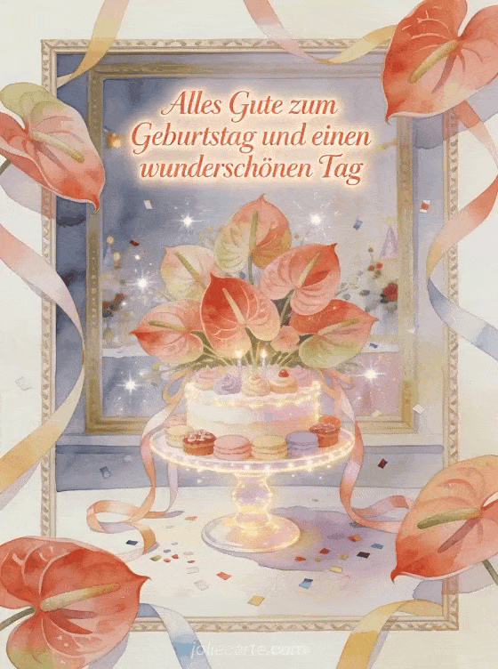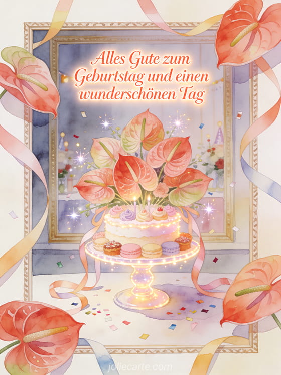 Senden Sie eine leuchtende Aquarell-Geburtstagskarte mit Anthurien, einem strahlenden Kuchenständer, pastellfarbenem Gebäck, Schleifen und funkelndem Konfetti. Dazu passen eine Alles Gute zum Geburtstag für die eigene Chefin Karte, eine Geburtstagsnachricht Arbeitskollege Karte oder eine Alles Gute zum Geburtstag von einer Arbeitskollegin Karte.