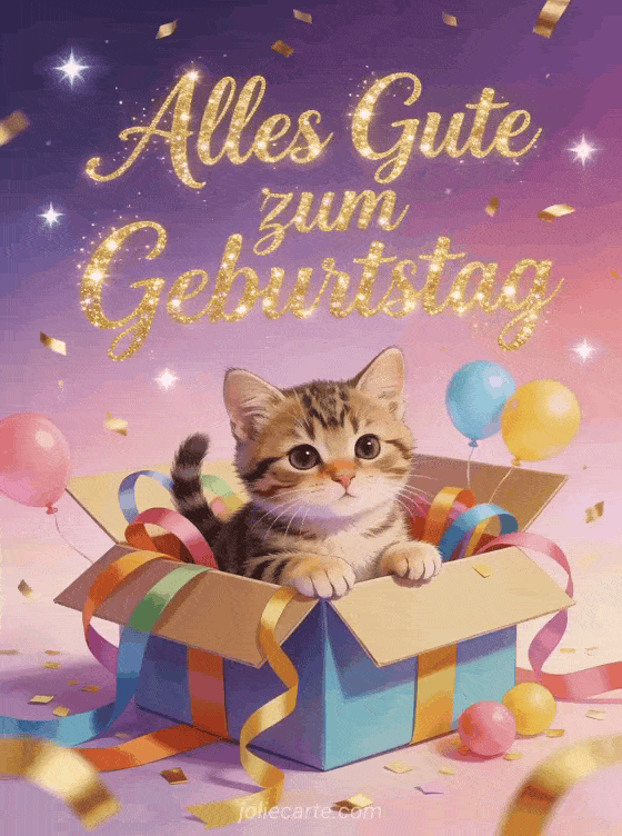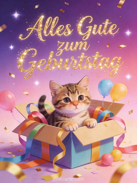 Versenden Sie einen entzückenden Geburtstagsgruß mit dieser süßen Karte mit einem Tigerkätzchen in einer Geschenkbox umgeben von Ballons und Bändern. Entdecken Sie auch eine Geburtstagskarte mit roter Katze oder eine Geburtstagskarte Feuerwerk oder eine Geburtstagskarte Berglandschaft.