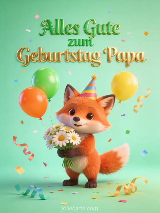 Mache den Geburtstag deines Papas unvergesslich mit dieser süßen Karte mit Fuchs, Margeriten und bunten Ballons. Entdecke auch geburtstag papa sms, einfacher Geburtstagstext Papa oder alles gute zum geburtstag papa text.