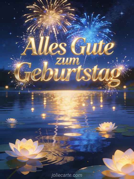 Sende eine Alles Gute zum Geburtstag Papa Karte mit majestätischer goldener Schrift, Feuerwerk über einem sternklaren Nachtsee, leuchtenden Spiegelungen und hellen Seerosen. Entdecke auch einen Geburtstagstext für seinen Papa, eine lustig alles Gute zum Geburtstag Papa witzig oder eine Kinderzeichnung Geburtstag Papa.