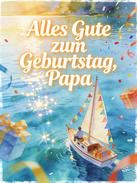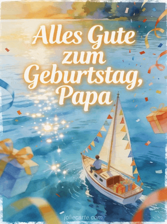 Sende eine Alles Gute zum Geburtstag Papa Karte mit elfenbeinfarbener Pinselschrift, einem Aquarell-Segelboot mit Geburtstagswimpeln auf einem funkelnden See, dazu Bänder und Konfetti über dem Rand. Entdecke auch animierte Bilder alles Gute zum Geburtstag Papa, ein Geburtstagsgedicht Papa Kind oder ein alles Gute zum Geburtstag Papa gif.