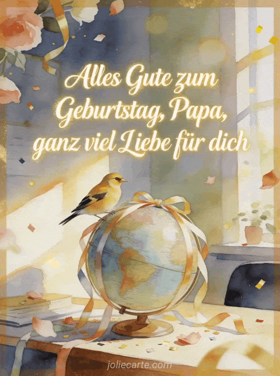 Sende eine Alles Gute zum Geburtstag Papa Liebe Karte mit fließender elfenbeinfarbener Schrift, einem Stieglitz neben einem Vintage-Globus mit Geburtstagsschleifen auf einem sonnigen Schreibtisch, dazu Blüten, Schleifen und Konfetti über dem Rand. Entdecke auch ein Alles Gute zum Geburtstag Gedicht für Schwiegerpapa, ein Alles Gute zum Geburtstag Gedicht für lieben Papa oder ein Geburtstagsgedicht für Papa ich hab dich lieb.