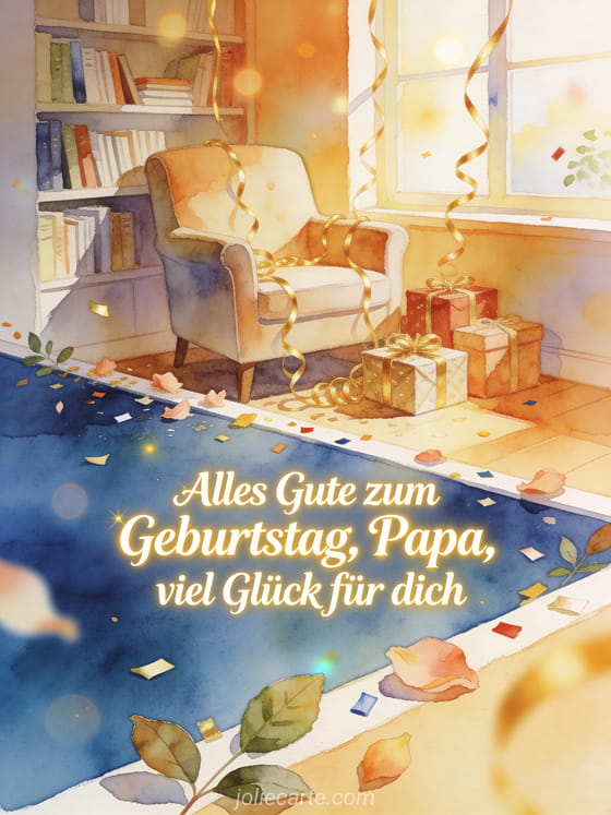 Teile einen alles gute zum geburtstag papa text mit einem gemütlichen Sessel, verpackten Geschenken und goldenen Luftschlangen in einer hellen Leseecke. Dazu passen einfach alles gute zum geburtstag papa, alles gute zum geburtstag papa herz oder alles gute zum geburtstag papa auto.