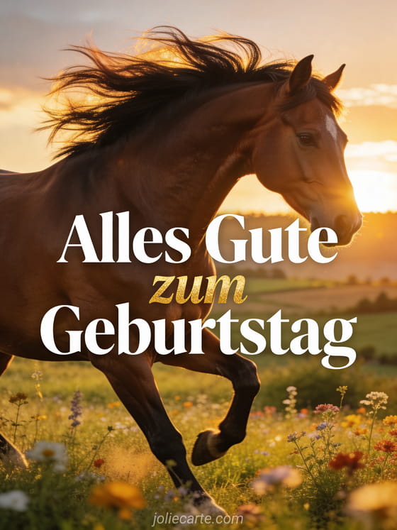 Teile diese Pferde-Geburtstagskarte mit warmem Abendlicht auf dem Land. Entdecke auch alles Gute zum Geburtstag und Katze, alles gute zum geburtstag strand und alles Gute zum Geburtstag Blumen Natur.