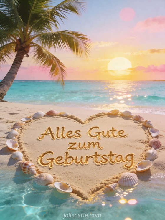 Senden Sie einen entspannenden Geburtstagsgruß mit dieser wunderschönen Karte mit dem Text im goldenen Sand eines Paradiesstrands mit türkisfarbenem Wasser und Muscheln. Entdecken Sie auch eine Geburtstagsüberraschungskarte oder eine Geburtstagskarte mit Rosen.