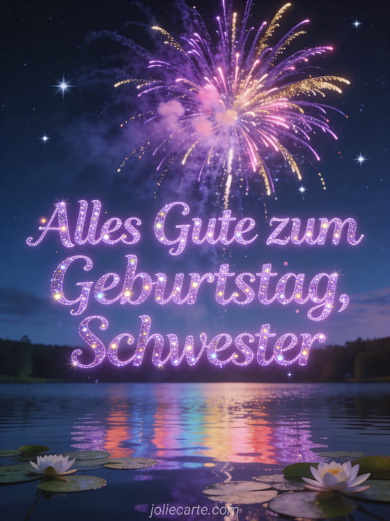 Feiere den Geburtstag deiner Schwester mit dieser atemberaubenden kostenlosen Karte. Spektakuläres violettes, rosa und goldenes Feuerwerk über einem ruhigen See mit farbigen Reflexen und funkelnden Sternen. Entdecke auch eine lustige Geburtstagskarte Schwester oder eine Geburtstag Schwester E-Karte oder eine Geburtstag E-Karte Schwester.