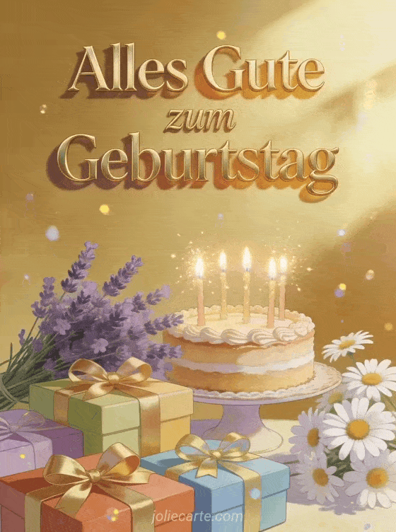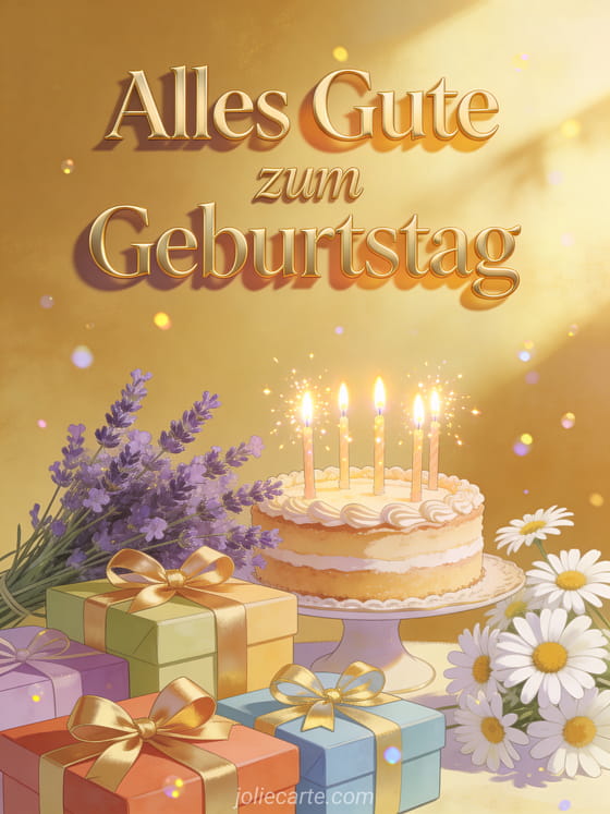 Sende eine Alles Gute zum Geburtstag Stiefpapa Karte mit klassischer goldener Schrift, Lavendel und Margeriten vor warmem Goldhintergrund, bunten Geschenken, leuchtenden Kerzen und einem eleganten Kuchen. Entdecke auch Papa ich wünsche dir alles Gute zum Geburtstag, eine Alles Gute zum Geburtstag Papa Karte oder animierte Bilder alles Gute zum Geburtstag Papa.
