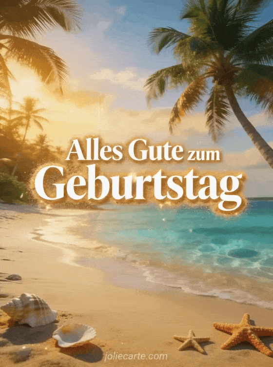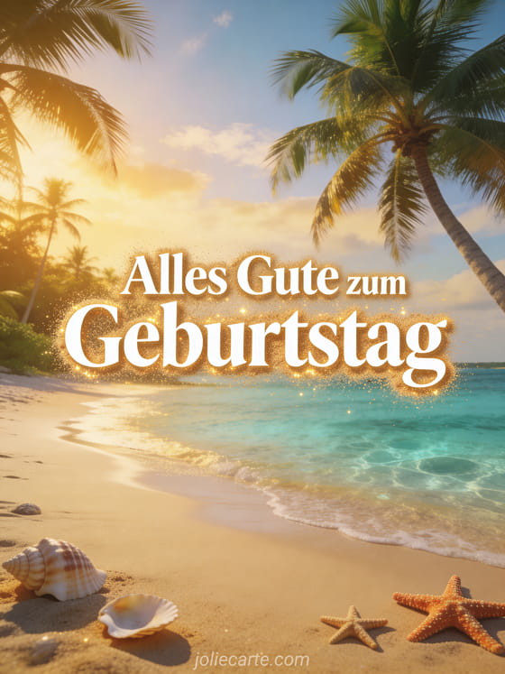 Feiere mit einer Strand-Geburtstagskarte mit kristallklarem Wasser, feinem Sand, Palmen und Muscheln im goldenen Licht. Entdecke auch alles gute zum geburtstag auto, alles Gute zum Geburtstag Blumen Natur und Geburtstag Bild.