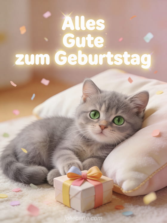 Teile einen süßen Geburtstagsmoment mit dieser warmen Illustration einer kleinen grauen Katze auf einem Kissen neben einem Geschenk und sanftem Konfetti. Entdecke auch alles gute zum geburtstag gif kostenlos, blume alles gute zum geburtstag blumen und bild alles gute zum geburtstag mit blumen.