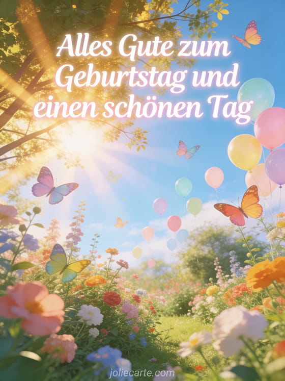 Sende diese Geburtstagskarte mit dem Wunsch für einen schönen Tag — ein sonniger Morgengarten mit goldenen Sonnenstrahlen durch die Äste, bunte Schmetterlinge und Pastellballons am blauen Himmel. Entdecke auch Geburtstag glänzend strahlend oder Geburtstag Katze Bild kostenlos.