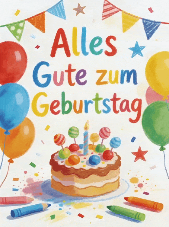 Sorge für gute Laune mit dieser bunten Geburtstagskarte mit Ballons, süß dekoriertem Kuchen, Wimpelgirlanden, Sternen und Konfetti. Entdecke auch alles gute zum geburtstag katze gif, virtuelle Geburtstagskarte Frosch alles Gute und Geburtstag Facebook teilen.