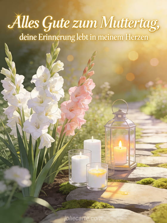 Ehre eine geliebte Mama mit einer friedlichen Muttertagskarte, in der ihre Erinnerung im Herzen weiterlebt, umgeben von Gladiolen, Kerzen und weichem Gartenlicht. Entdecke auch eine Muttertagskarte, kostenlose Muttertagsbilder oder einen Muttertag Text.