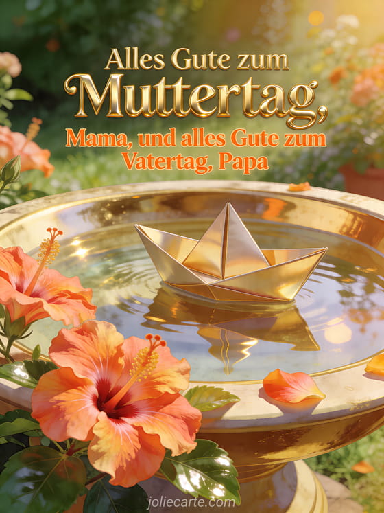 Sende einen ausgewogenen familiären Gruß für Mama und Papa mit fotorealistischen gefalteten Segelbooten in einem hellen Gartenteich, leuchtenden Hibiskusblüten, glänzenden Blättern und festlichen Reflexen. Entdecke auch eine kostenlose Karte Alles Gute zum Vatertag, eine Karte Papa Vatertag oder Glückwünsche zum Vatertag.