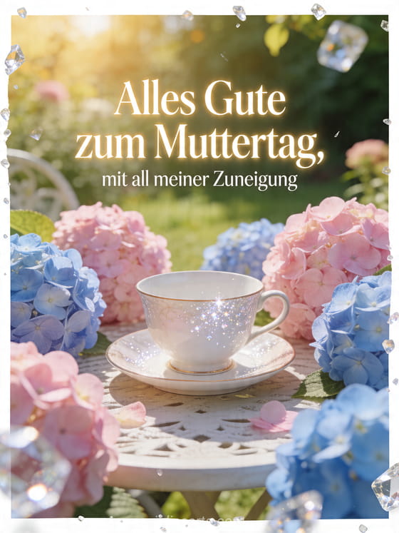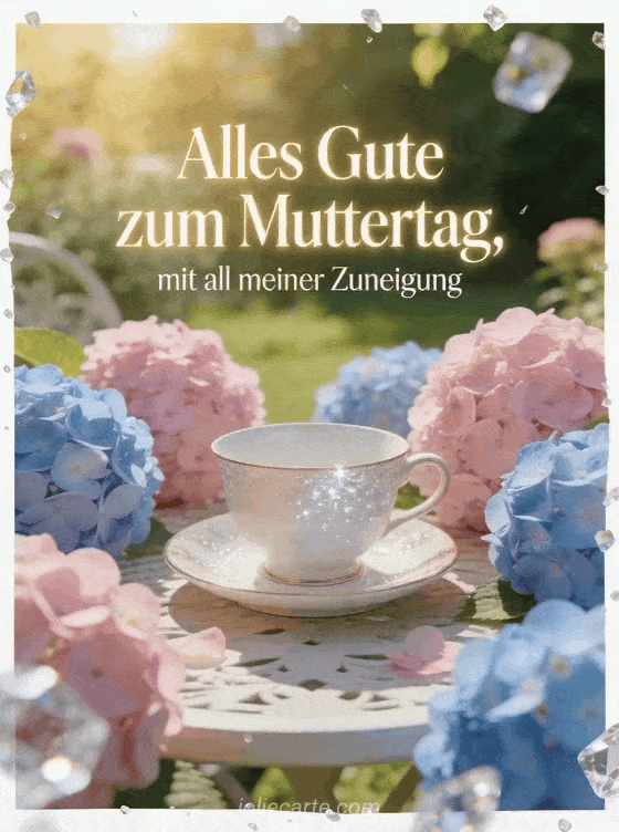 Sende Alles Gute zum Muttertag Schwiegermutter mit feiner Champagnerschrift, sanftem Leuchten und einer fotorealistischen Porzellantasse zwischen vollen Hortensien auf einem sonnigen Gartentisch. Diese liebevolle Karte wirkt frisch, elegant und hell. Entdecke auch Muttertag für meine Tochter, Text zum Muttertag oder Muttertagsgedichte.