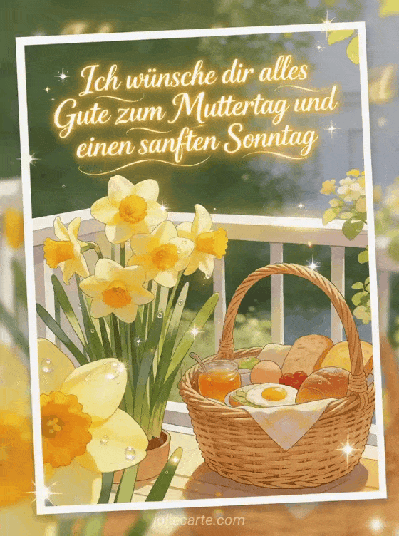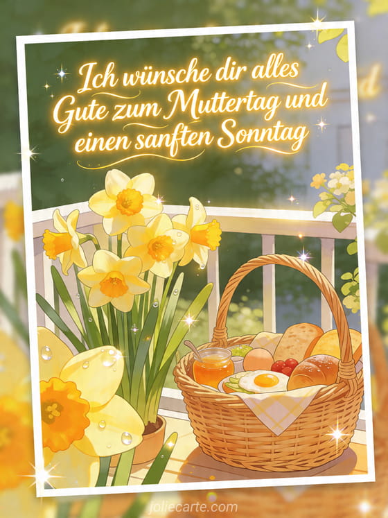 Teilen Sie eine leuchtende Botschaft zum Muttertag und für einen sanften Sonntag, mit Frühstückskorb, strahlenden Narzissen und einem Frühlingsbalkon. Entdecken Sie auch Zitate zum Muttertag, eine Karte zum Muttertag oder gratis Muttertagsbilder.