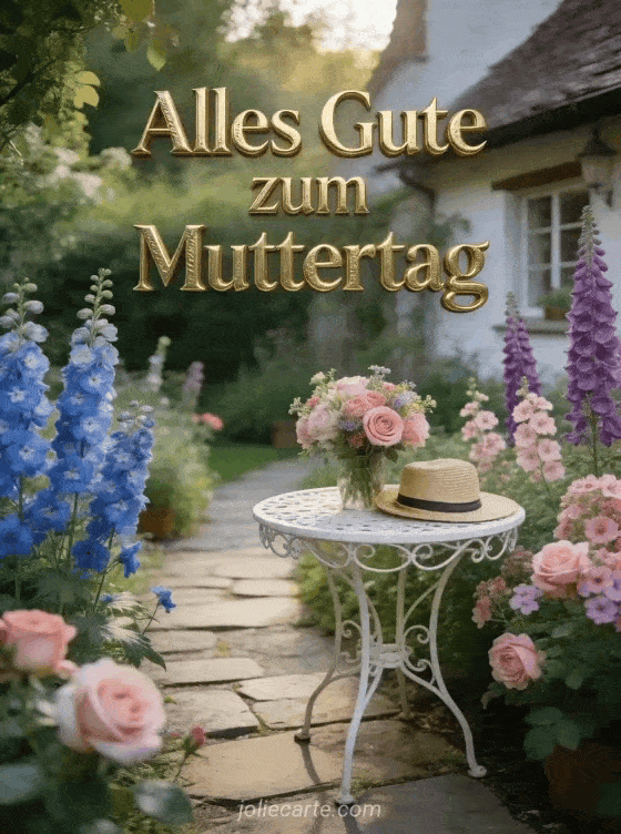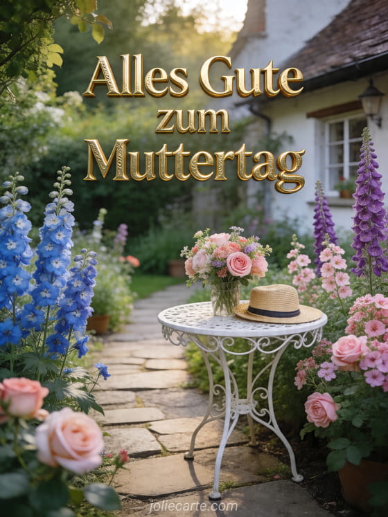 Teile eine helle Muttertagskarte mit goldener Schrift, Cottage-Blumen und sanftem Nachmittagslicht. Entdecke auch eine Karte alles Gute zum Muttertag liebe Mama, eine Poesie über den Muttertag oder ein Muttertagsbild.