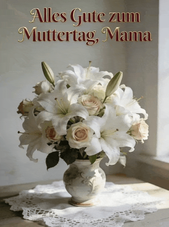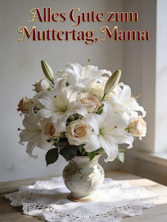 Schenke einen klassischen und eleganten Gruß mit einem Bouquet aus weißen Lilien und alten Rosen in einer Porzellanvase auf einer Spitzentischdecke. Dazu passen Muttertag, Muttertagszeichnungen oder Gedichte zum Muttertag.
