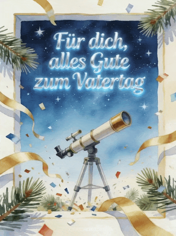 Versende alles Gute zum Vatertag für meinen Sohn mit leuchtend silberner Schrift, einer Gouacheillustration eines kleinen Teleskops unter einem hellen sommerlichen Sternenhimmel, Kieferzweigen, goldenen Luftschlangen und festlichem Konfetti. Entdecke auch ein kostenloses Vatertagsbild, eine schöne Vatertagskarte oder Alles Gute zum Vatertag an alle Papas.