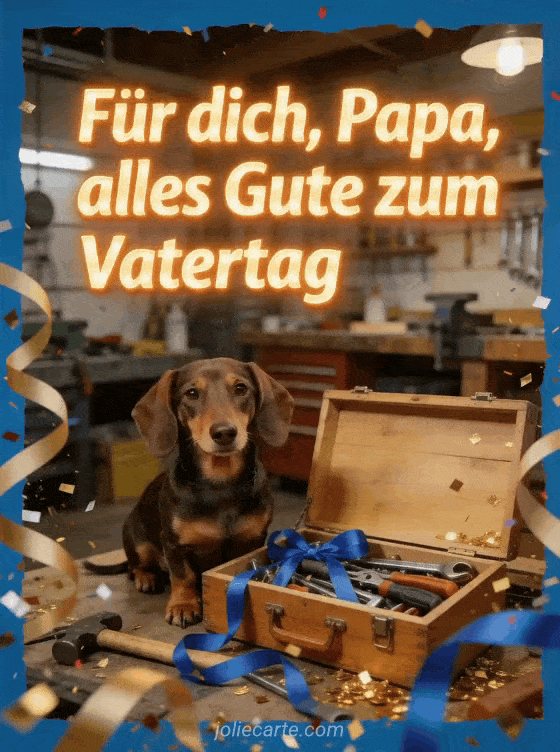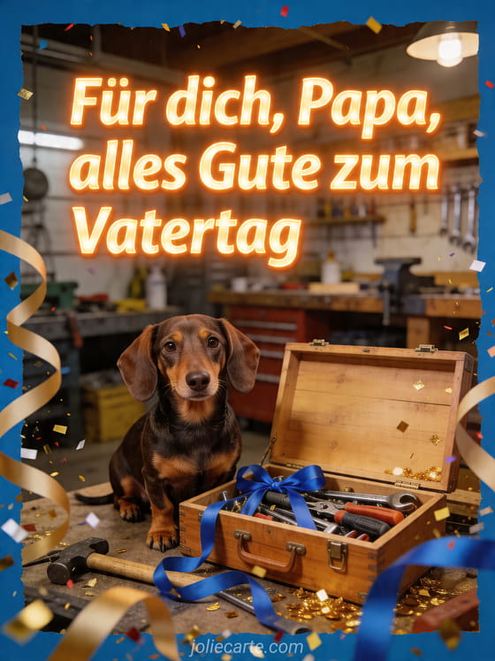 Sende ein herzliches alles Gute zum Vatertag Papa Bild mit einem fotorealistischen Dackel neben einem offenen Holzwaren-Werkzeugkasten voller polierter Werkzeuge, blauer Schleifen, goldenem Konfetti und einer hellen Werkstattszene. Entdecke auch süße Worte zum Vatertag, alles Gute zum Vatertag mein Sohn oder Liebe Vatertag Text Liebe.