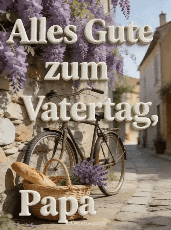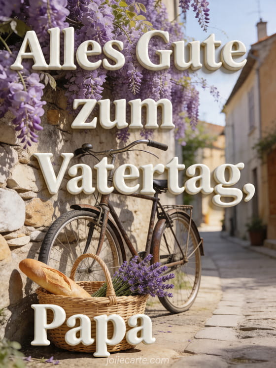 Senden Sie einen nostalgischen Gruß mit Alles Gute zum Vatertag, einem Retro-Fahrrad an einer Steinmauer mit malvenfarbener Glyzinie, einem Weidenkorb mit Brot und Lavendel und einer sonnigen provenzalischen Gasse. Entdecken Sie auch eine Grußkarte zum Vatertag, ein Papa Vatertag Bild oder Alles Gute zum Vatertag mein Liebling.