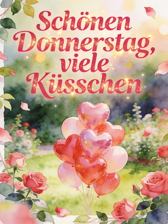 Teile Schönen Donnerstag, viele Küsschen mit rosenroter Schrift, herzförmigen Ballons auf einer hellen Gartenlichtung, Rosenblüten und Blütenblättern über dem Rand. Entdecke auch schöne Bilder für schönen Donnerstag, sonniges Schönen-Donnerstag-Bild oder Bilder für schönen Donnerstag.