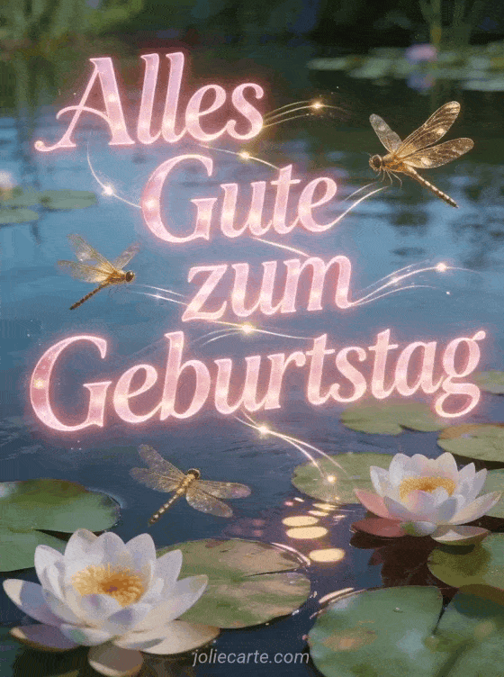 Sende dieses zauberhafte animierte Geburtstags-GIF für Frauen mit goldenen Libellen und blühenden Seerosen. Entdecke auch eine Geburtstags-GIF für Frauen oder eine Geburtstagsworte Frau.