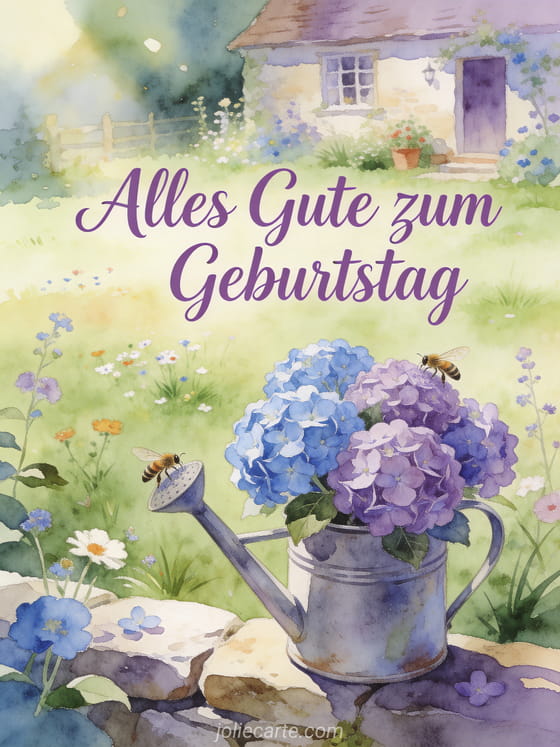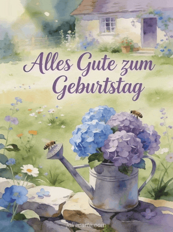 Sende dieses animierte Geburtstags-Gif mit blauen und violetten Hortensien in einer vintage Gießkanne voller Charme. Entdecke auch kostenlose animierte Geburtstagsgrüße oder eine kostenlose animierte Geburtstagskarte mit Musik.