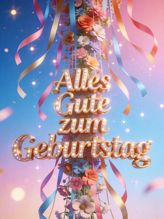 Verschicke diese fröhliche animierte Geburtstagskarte mit goldenen Glitzerlettern und einem bunten Blumen- und Bänderregen im festlichen 3D-Stil. Eine kostenlose Karte für ihren besonderen Tag. Entdecke auch elegante Geburtstagskarte für Frauen oder Geburtstagsgruß für Frauen.