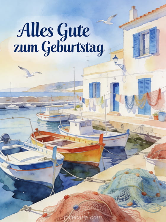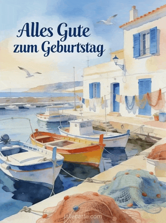 Überraschen Sie ihn mit dieser beeindruckenden animierten Karte mit einem malerischen Aquarellhafen. Entdecken Sie auch eine lustiger witziger Geburtstagsgruß Mann oder eine Geburtstagskarte Mann kostenlos.
