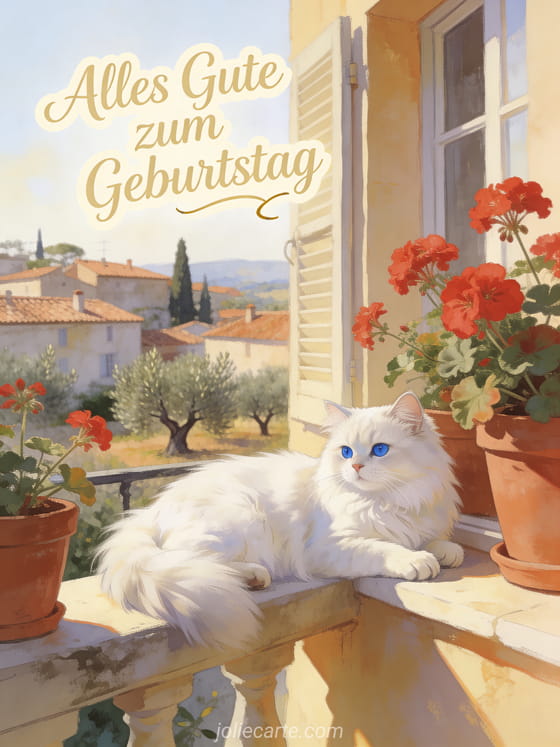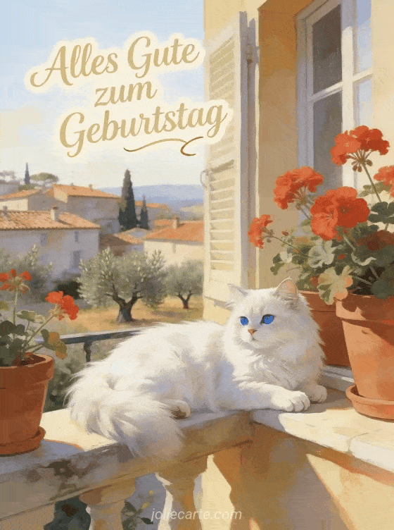 Verschicke diese bezaubernde animierte Geburtstagskarte mit einer weißen Perserkatze mit blauen Augen auf einem sonnigen Fensterbrett mit Blumentöpfen und roten Geranien vor einem provenzalischen Dorf. Eine kostenlose Karte mit mediterránem Charme. Entdecke auch animiertes Geburtstags-GIF oder kostenlose animierte Geburtstagskarte.