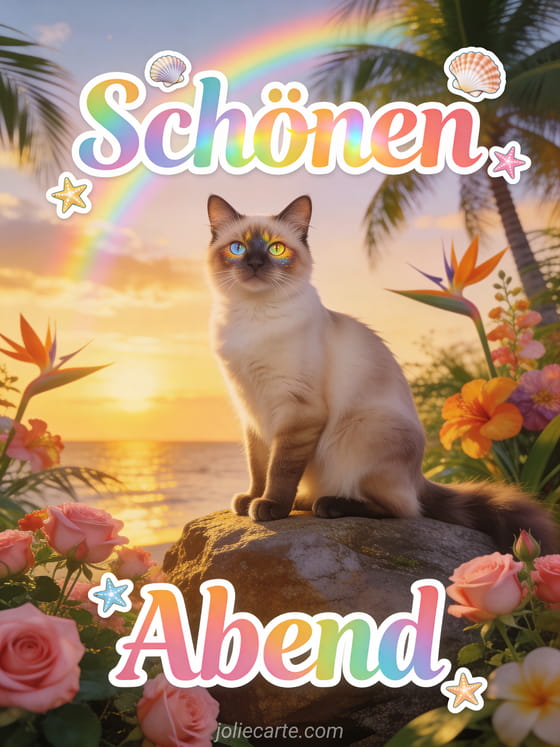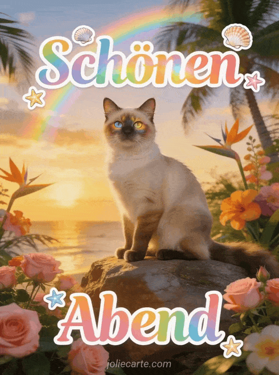 Schicke eine herzliche animierte Guten-Abend-Karte mit dieser bunten kostenlosen Karte mit einer Türkisch Van Katze in einer tropischen Dämmerungsszene. Entdecke auch einen Guten Abend Text oder Guten Abend Küsschen.