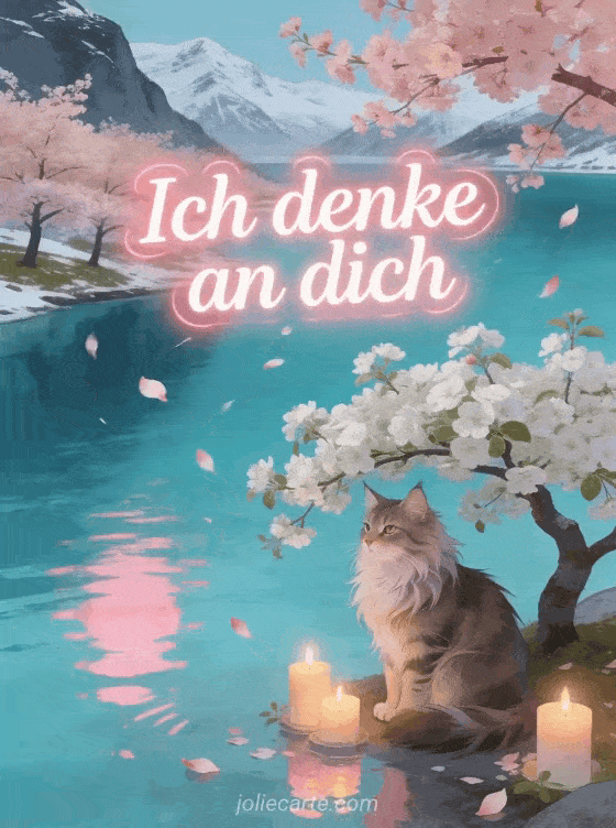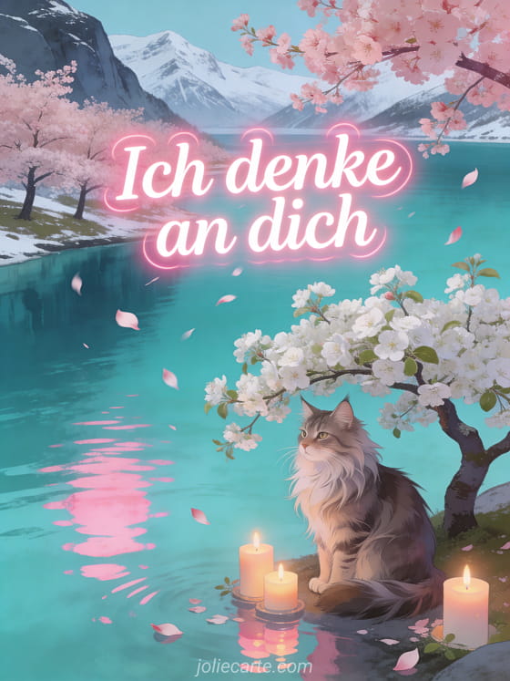 Teile diese wunderschöne animierte Karte ich denke an dich mit Kirschblüten über einem türkisen Fjord und einer majestätischen Maine Coon Katze. Entdecke auch eine Karte ich denke an dich oder kostenloses Bild ich denke an dich.