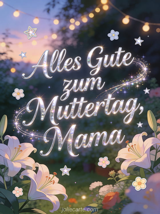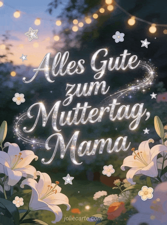 Überraschen Sie Mama mit dieser wunderschönen animierten Muttertagskarte mit schimmernder Silberschrift und Lilien unter Lichterketten. Entdecken Sie auch ein Muttertag Bild oder eine schöne Muttertagskarte.