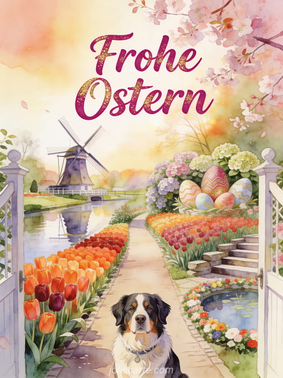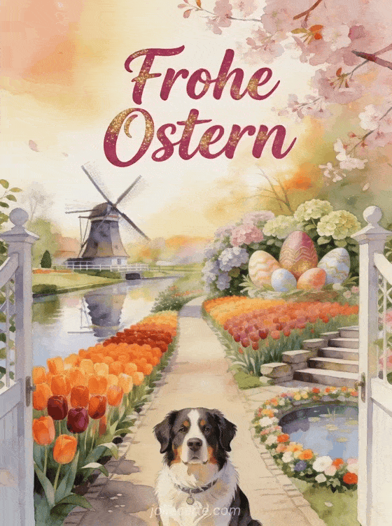 Feiern Sie Ostern mit dieser bezaubernden kostenlosen animierten Grußkarte mit ein Australian Shepherd am Eingang eines Gartenwegs in Keukenhof mit Tulpen in Sonnenuntergangstönen, einer Windmühle im Kanal gespiegelt und Ostereiern zwischen Hortensien. Entdecken Sie auch cartes virtuelles joyeuses paques gifs joyeuses paques.
