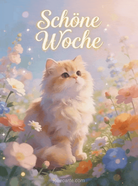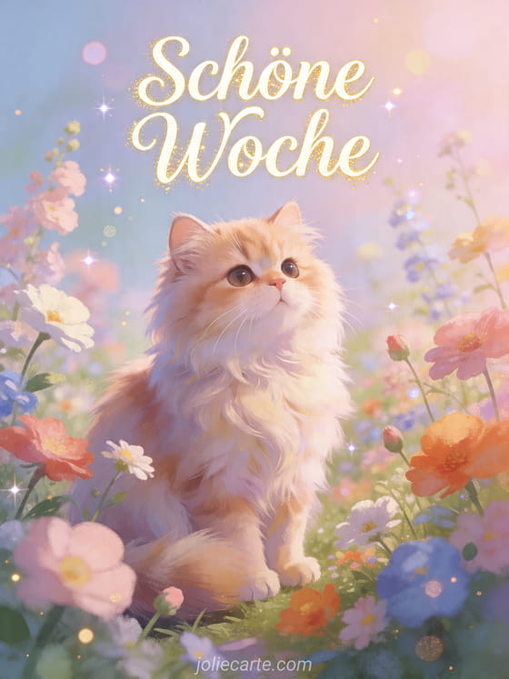 Teile mit dieser kostenlosen Karte eine süße Schöne Woche Botschaft mit einer flauschigen Perserkatze zwischen bunten Frühlingsblumen in einer verträumten Pastellszene. Entdecke auch entspannte woche, bild hallo schöne woche küsschen oder humorvolle schöne woche.