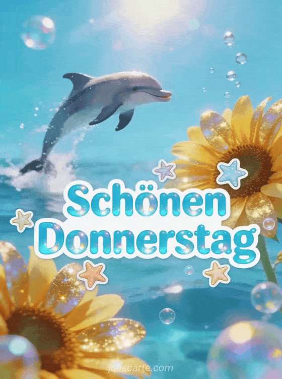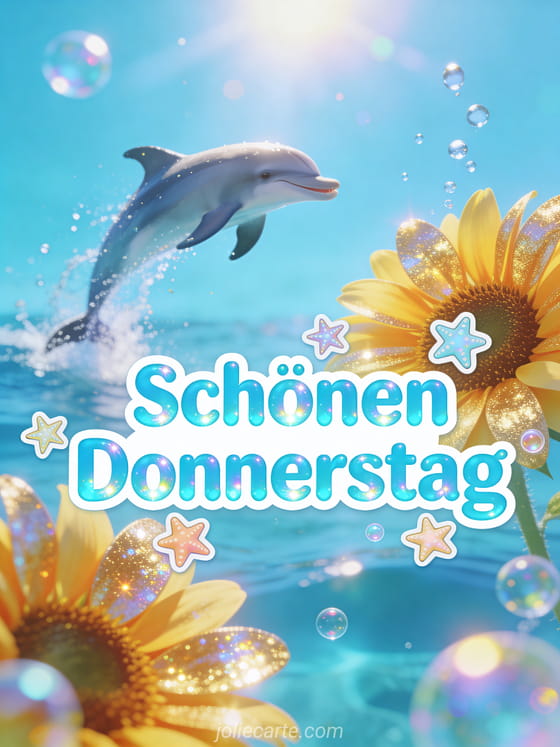 Verschicke einen fröhlichen Gruß zum Donnerstag mit kräftiger türkisfarbener Schrift, Seesternen, irisierenden Blasen, leuchtenden Sonnenblumen im Vordergrund und einem Delfin, der im intensiven Sonnenlicht aus dem Wasser springt. Dazu passen auch diese schönen Donnerstag Küsse, diese Guten Morgen schönen Donnerstag Karte oder diese kostenlose Karte schönen Donnerstag.