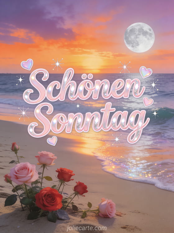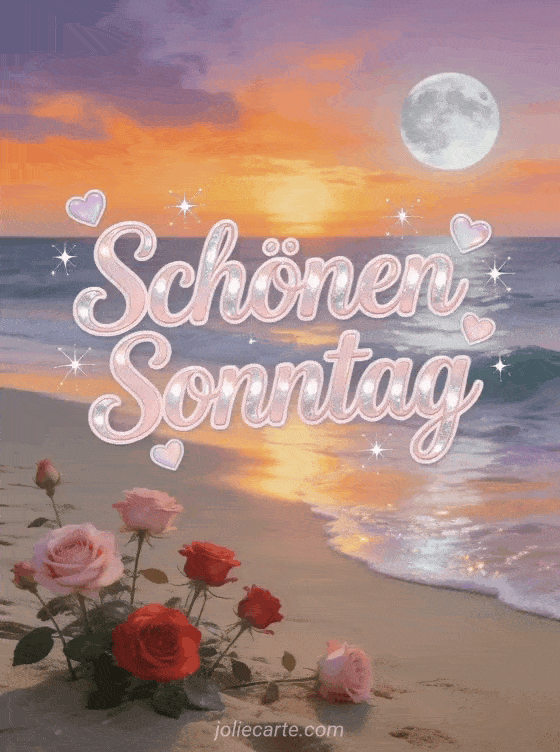 Sende eine animierte Schönen-Sonntag-Karte mit puderrosa Schreibschrift, silbernen Reflexen, pastellfarbenen Herzen und Sternschnuppen über einem Strand bei Sonnenuntergang. Teile einen romantischen Sonntagswunsch und entdecke auch Schönen Sonntag Humor animiertes GIF, Guten Morgen schönen Sonntag Bild oder Schönen Sonntag und schönen Tag.