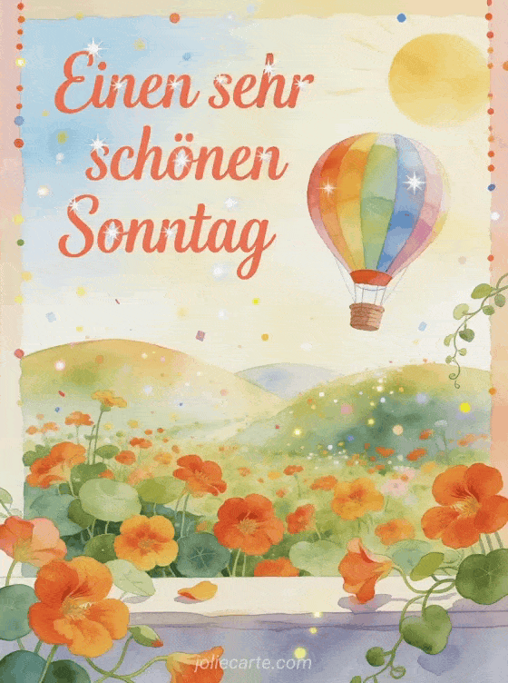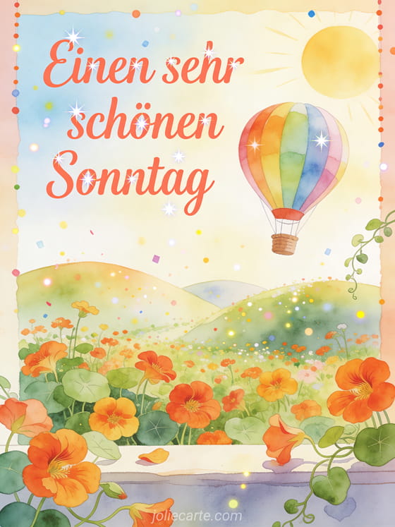 Sende einen festlichen Sonntagswunsch mit einem bunten Heißluftballon über einem sonnigen Garten voller Kapuzinerkresse. Entdecke auch Sonntagsküsse Bild, schönen sonntag karte oder kurzer Text um einen schönen Sonntag zu wünschen.