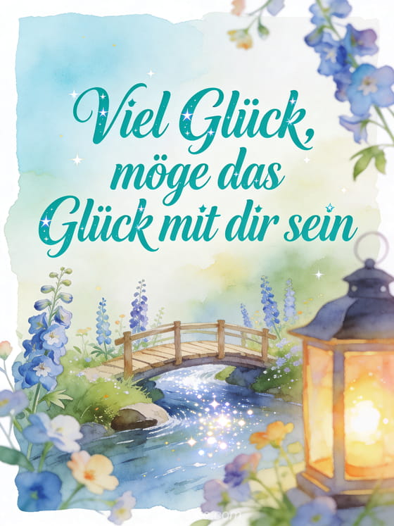 Wünsche viel Glück mit einer abenteuerlichen Aquarellszene: eine kleine Holzbrücke über einem funkelnden Bach, Ritterspornblüten und eine leuchtende Laterne. Du kannst auch eine Viel-Glück-Nachricht für einen Wettbewerb, ein Viel Glück Bild mit einem Pferd oder ein Viel Glück Ermutigung GIF senden.