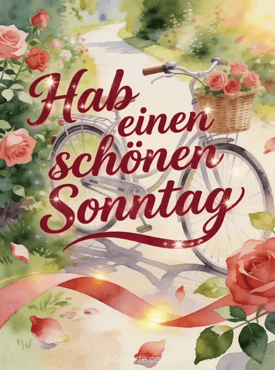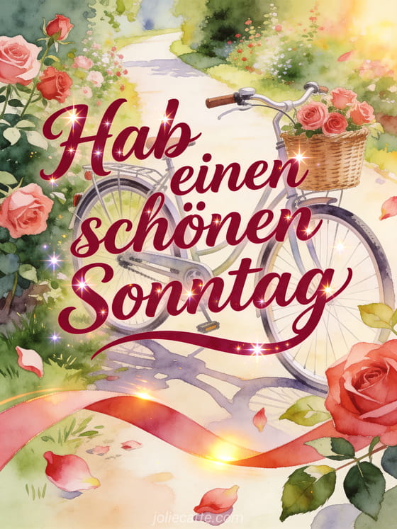 Sende einen fröhlichen Gruß zum schönen Sonntag mit lebhafter rubinroter Schrift, funkelnden Akzenten, einem Vintage-Fahrrad mit geflochtenem Korb, Rosenblüten, einem hellen Gartenweg und warmem Licht. Teile auch ein Sonntag Küsse GIF, ein Schönen Sonntag religiöses GIF oder Karten um schönen Sonntag zu wünschen.