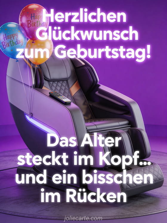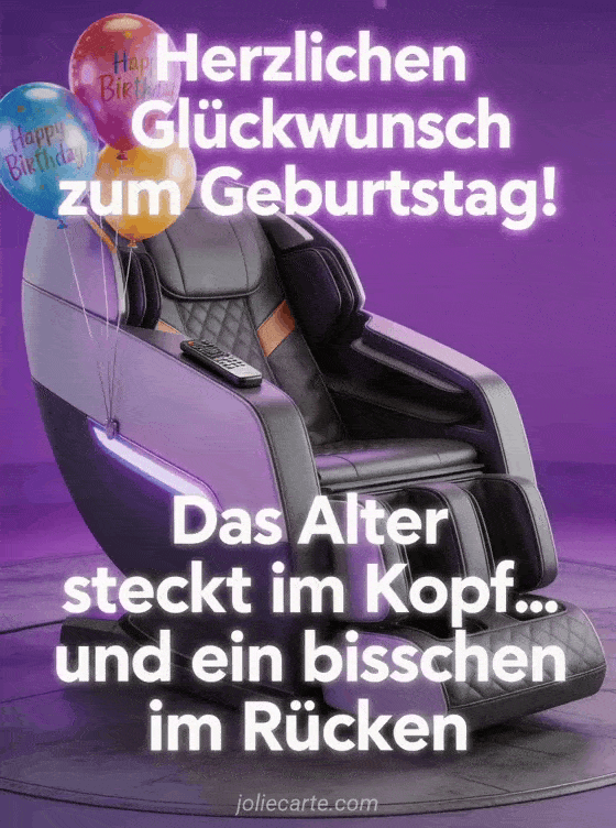 Sende diese animierte Geburtstagshumor-Karte mit einem High-Tech-Massagesessel und Geburtstagsballons. Entdecke auch ein witziges Geburtstagsbild oder einen witziger Geburtstagsspruch.