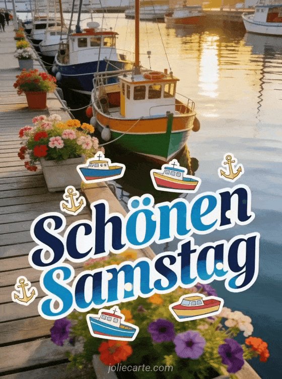 Teilen Sie eine fröhliche Karte zum schönen Samstag mit marineblauer Schrift, weißen Akzenten, bunten Booten und goldenen Ankern, einem blumigen Kai, festgemachten Fischerbooten und Pflanzkästen voller Geranien und Petunien. Sehen Sie auch Schönen Samstag an alle GIF, schönen Frühlingssamstag oder dieses Bild für schönen Samstag.