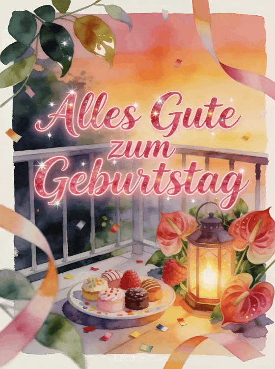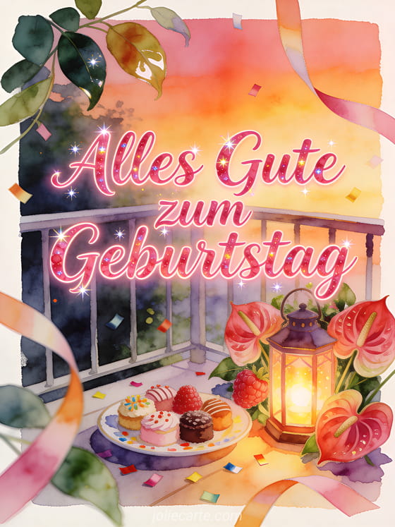 Teile einen strahlenden Geburtstagsgruß mit himbeerfarbener Kalligrafie, Anthurienblüten, einer leuchtenden Laterne und Leckereien auf einer festlichen Terrasse. Entdecke auch einen Alles Gute zum Geburtstag Mama einfacher Text, einen Alles Gute zum Geburtstag Schwiegermama Text oder eine kostenlose alles gute zum geburtstag mama karte.