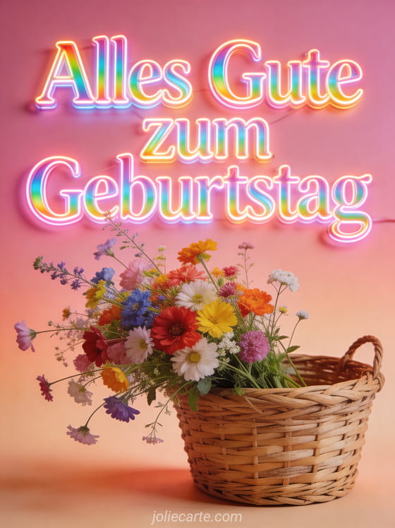 Wünsche einer besonderen Frau alles Gute zum Geburtstag mit dieser atemberaubenden animierten Karte mit Regenbogen-Neon-Leuchtbuchstaben und einem bunten Wildblumenstrauß in einem Weidenkorb auf einem zarten rosa-pfirsichfarbenen Verlaufshintergrund. Entdecke auch eine Geburtstagskarte Frau mit Hund oder Bilder Geburtstag Frau Humor.