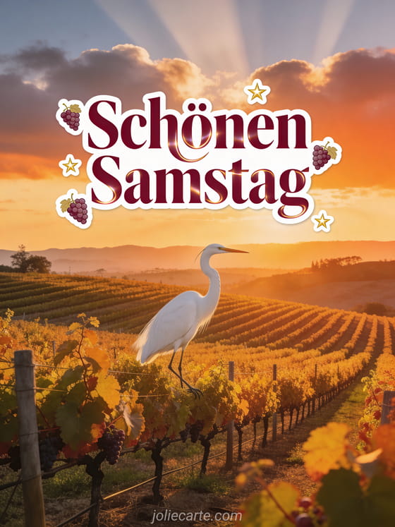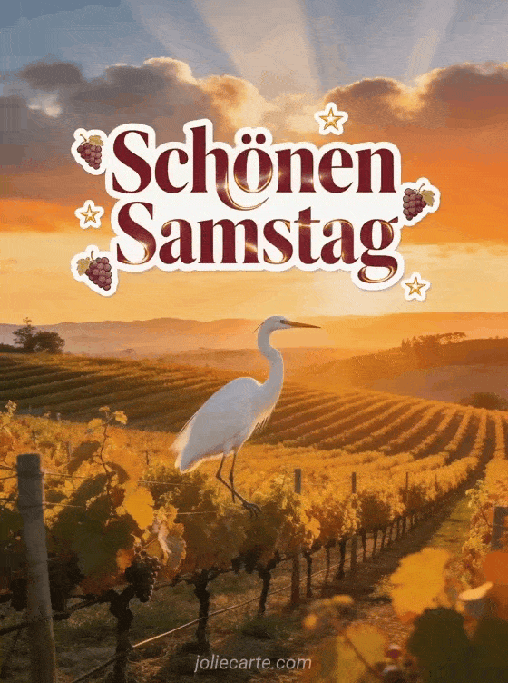 Sende einen herzlichen schönen Samstag mit einem Weinberg im Napa Valley, goldenen Rebenreihen, Traubenstickern und einem majestätischen Silberreiher, der im orangefarbenen Sonnenuntergangslicht landet. Entdecke auch Schönen Samstag Freunde GIFs, Freundschaft schönen Samstag schönes Wochenende oder guten Morgen schönen Samstag Küsse.
