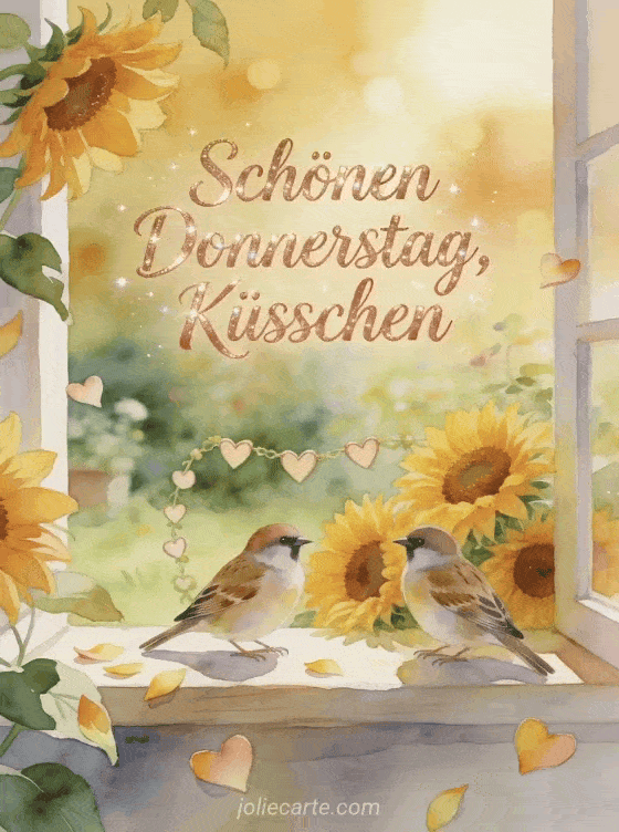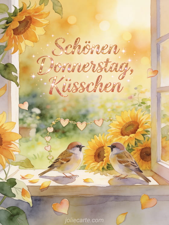 Teile einen hellen Donnerstagsgruß mit Küsschen, Sonnenblumen und einer sanften Gartenszene in Aquarell. Entdecke auch schönen Donnerstag an alle Bilder, guten Morgen Donnerstag gif oder kostenlose virtuelle schönen donnerstag karten.