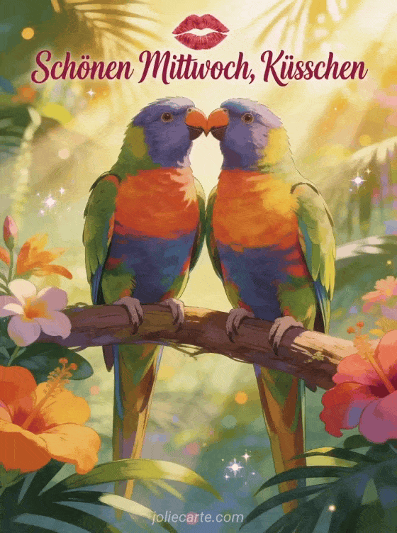 Sende zärtliche Küsschen zum schönen Mittwoch mit zwei bunten Papageien, die sich auf einem tropischen Ast an den Schnäbeln berühren, umgeben von exotischen Blumen und warmem goldenem Licht. Entdecke auch ein Schönen Mittwoch Katzen-GIF, ein Schönen Mittwoch witziges Humorbild oder eine Schönen Mittwoch animierte Karte.