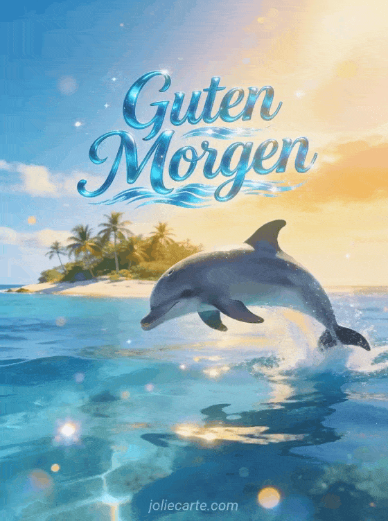 Teile ein schönes animiertes Guten Morgen Bild mit einem verspielten Delfin, der bei Sonnenaufgang aus dem kristallklaren Wasser springt, mit einer tropischen Insel im Hintergrund. Entdecke auch ein Guten Morgen Foto, eine schönen Guten Morgen wünschen Karte oder Guten Morgen Bilder.