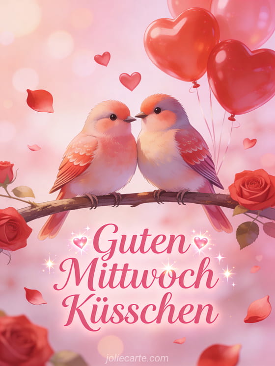 Teile süße Mittwochsküsse mit dieser romantischen Karte mit zwei Unzertrennlichen auf einem Ast umgeben von herzförmigen Ballons und Rosenblättern. Entdecke auch guten morgen mittwoch oder Guten Morgen guter Mittwoch zen für mehr Mittwochsinspiration.